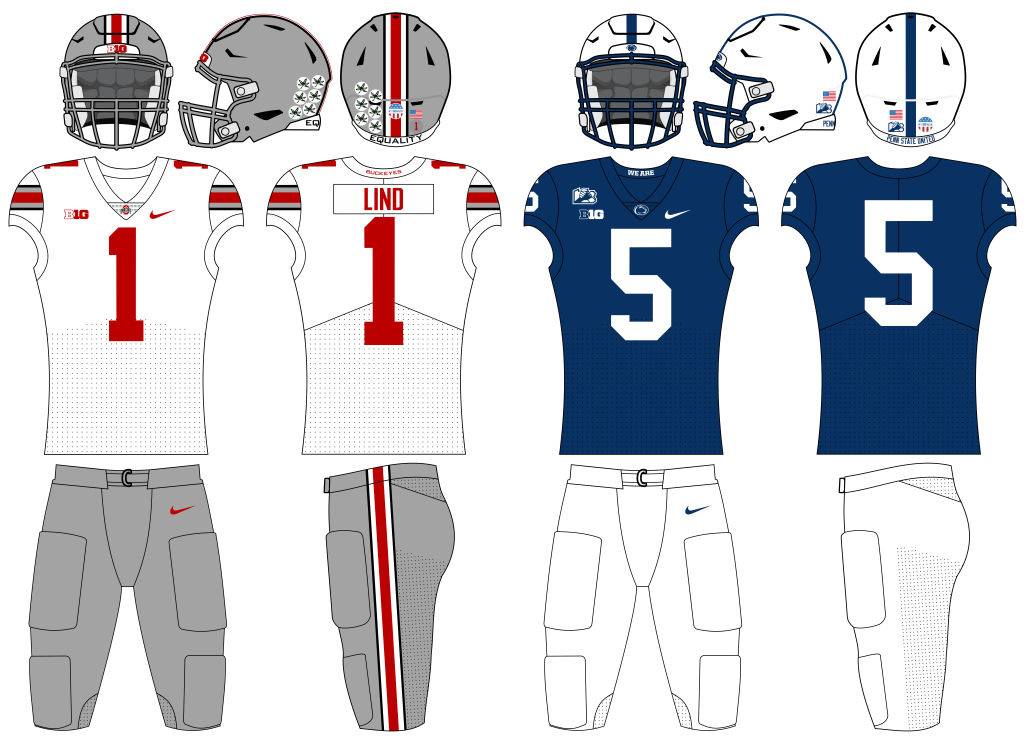 Quarterback Justin Fields (No. 1) threw for 318 yards and four touchdowns – including two apiece to wide receiver Chris Olave and tight end Jeremy Ruckert – to lead Ohio State to a relatively easy win at Penn State. Both the Buckeyes and Nittany Lions wore a “B1G Vote” helmet decal as part of the Big Ten’s initiative to raise awareness about the importance of voting.